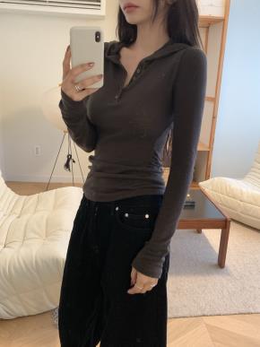 フードハーフボタン長袖スリムシャーリング無地Tシャツ