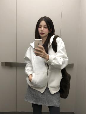 裏起毛ハーフルーズダブルジップカンガルーポケットフードドローストリング長袖レタリングジップパーカー
