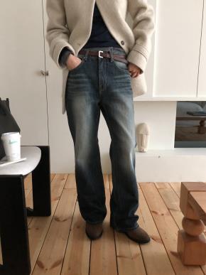 コットンデニムセミワイドジップアップボタンループポケットバックポケットウォッシングライトブルーデニムパンツ