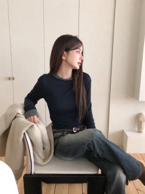 リブストレッチソフトラウンドネックスリム長袖Tシャツ