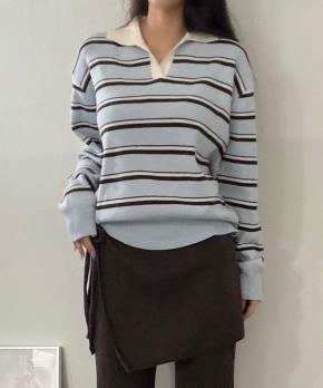 長袖ルーズオープンカラーハーフボーダー配色ニットSS