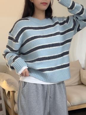 ウール混アルパカ混紡ルーズ長袖Vネックボーダー配色ニット