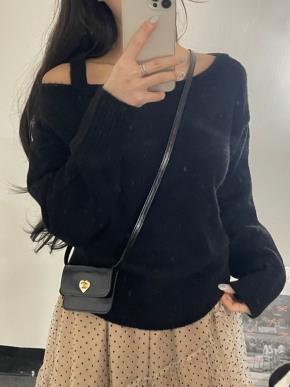 ウール混ペンダントルーズスクエアネックオフショルダー長袖ニット