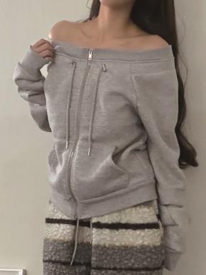 裏起毛オフショルダー長袖カンガルーポケットドローコードジップアップ無地スウェット