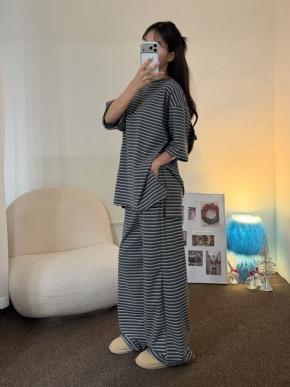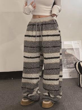 ピーチ起毛ワイドロングウエストゴムドローストリングボーダー配色トレーニングパンツ