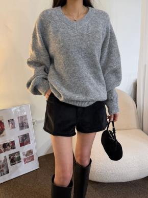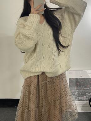 ウール混ラグラン長袖Vネックラウンドネックペンダントルーズ無地ニット
