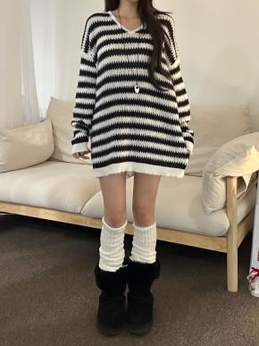 ラウンドネックオーバーサイズロング長袖ビッグボーダーニット