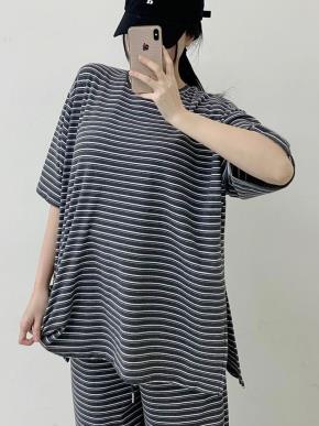 ピーチ起毛ラウンドネック半袖スリットボクシーボーダー配色Tシャツ