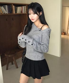 リブストレッチボタンカラーオフショルダースリム長袖ダイアゴナルニット2WAY