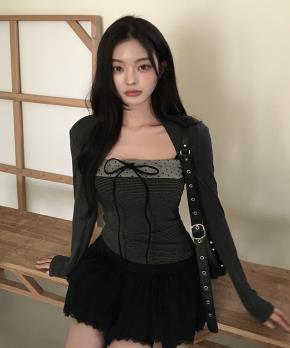 ニットボタンラウンドネックドローストリングスリム長袖カーディガンチューブトップアンサンブル