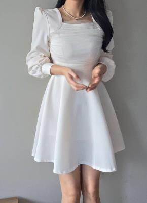 チュールコンビジップアップドレープスクエアネックパフスリーブ長袖ギャザーフレアAラインミニワンピース
