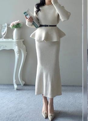 リブボートネックウエストゴムドルマンスリムロングルーズ長袖フレアマーメイド無地ツーピース(トップス、ボトムス)スカートニットベルト付