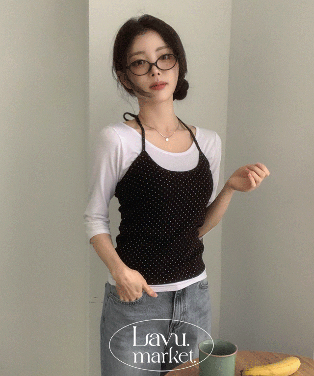 配色スリム長袖レイヤード風ウォーマースクエアネックドットTシャツ