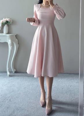 レースチュールコンビジップアップドレープスクエアネックラインパフスリーブロング長袖ギャザーフレアAライン無地ワンピース