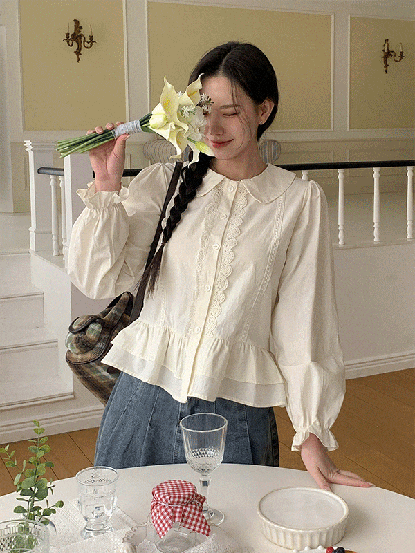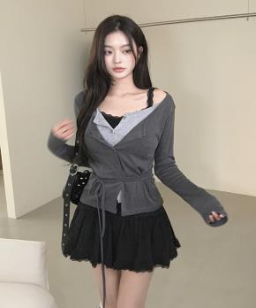 レイヤード風スリムクロップドボタンシャーリング長袖リボンレースTシャツ