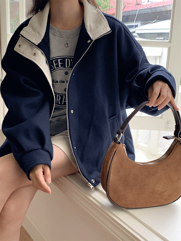 メルトンタッチルーズジップアップパフスリーブ長袖ポケットハイネックスナップボタンジャンパー