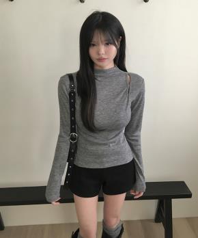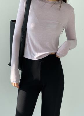 ウール混シースルーボートネック長袖スリム無地Tシャツ