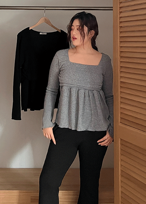 リブスクエアネックメロウベルスリーブ長袖フレア無地ブラウス
