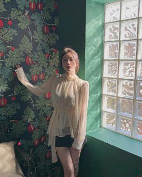 シースルーボタンカラーリンクルオーバーサイズ長袖ボタンスリーブ無地シャツ