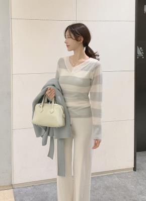 シャギーウール混アルパカ混紡Vネックスリムボーダー配色ニット