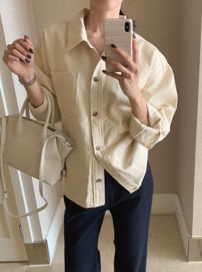 コットンボタンカラードローストリング長袖セミクロップドシャツ