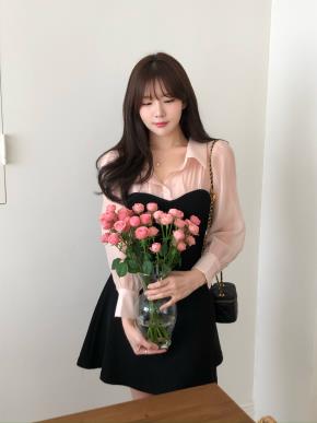 オーガンジー長袖ストラップジップアップベーシックアンバランスギャザーブラウス