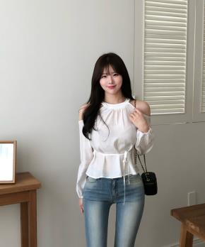 ジップアップストラップホルターネックパフスリーブオープンショルダー長袖ギャザー無地ブラウス