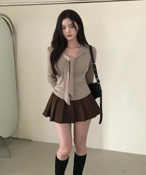 リブレースコンビリボンボタンストラップUネックドローストリングクロップドスリム長袖カーディガンノースリーブアンサンブル