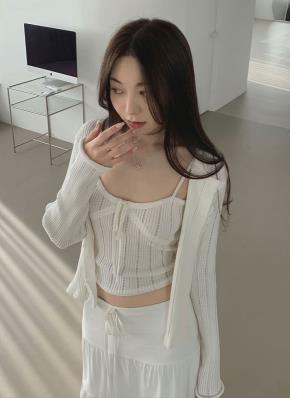 ストラップホルターネッククロップドスリムレイヤード風長袖無地カーディガンキャミソール