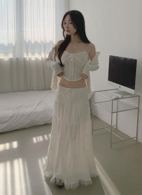 レースコンビコットンドローストリングフリルティアードローライズロングギャザー刺繍無地スカート