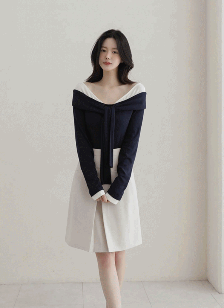 ウール混オフショルダーボウタイ長袖レイヤード風配色Tシャツ