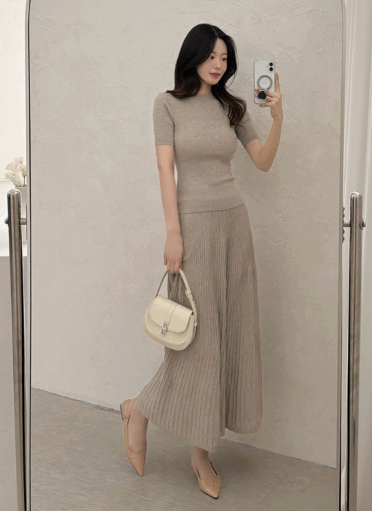 リブ半袖ラウンドネックスリムロングフレア無地ニットスカートツーピース(トップス、ボトムス)