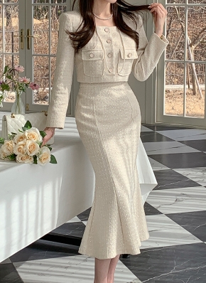 ツイードキルティングダックダウンウール混ボタンラウンドネックノーカラーポケット長袖ジャケット