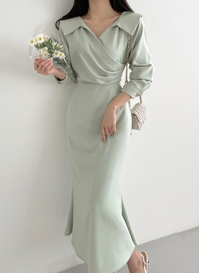 起毛ドレープロングオフショルダーシャーリングスリムスリットワンピース