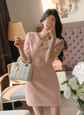 ツイードボタンハートネックパール調ボタンロング長袖ワンピース