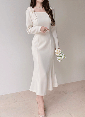 リブニットロングスクエアネック長袖スリムワンピース