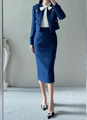 ゴールドボタンフリンジツイードジャケット&IラインスカートSET