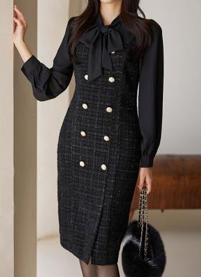 リボンシフォンブラウスレイヤードツイードワンピース
