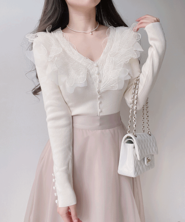 マフラー付ストレッチソフトVネックフリルスリム長袖ニット
