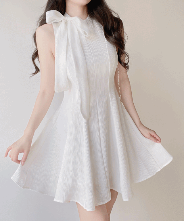 シフォンリボンフレアHラインプリーツミニノースリワンピース