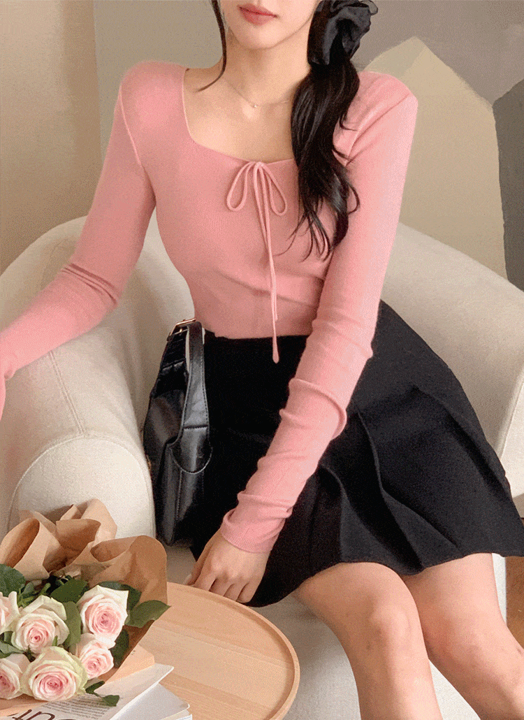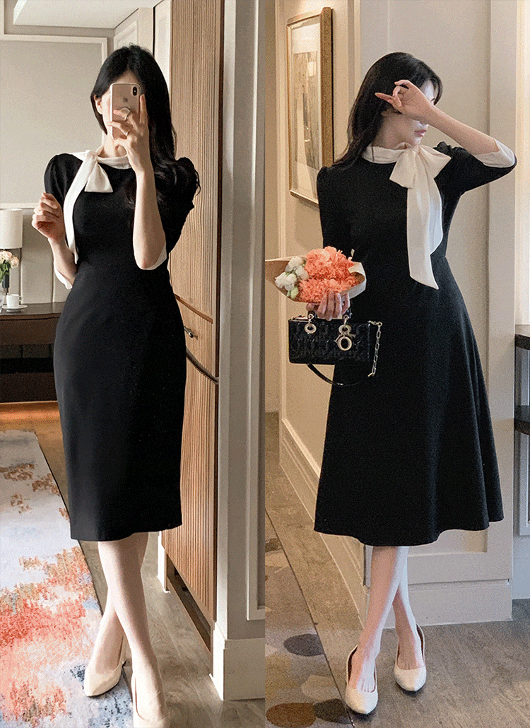 ストラップ付ハーフネック長袖ミニボウタイワンピース