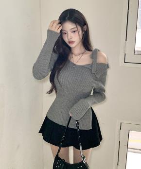 リブスリムワンショルダーオフショルダードローストリングスリットニット