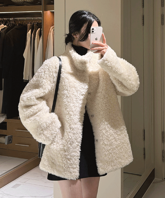 ムートンエコファーハイネックポケット長袖スナップボタンジャンパー