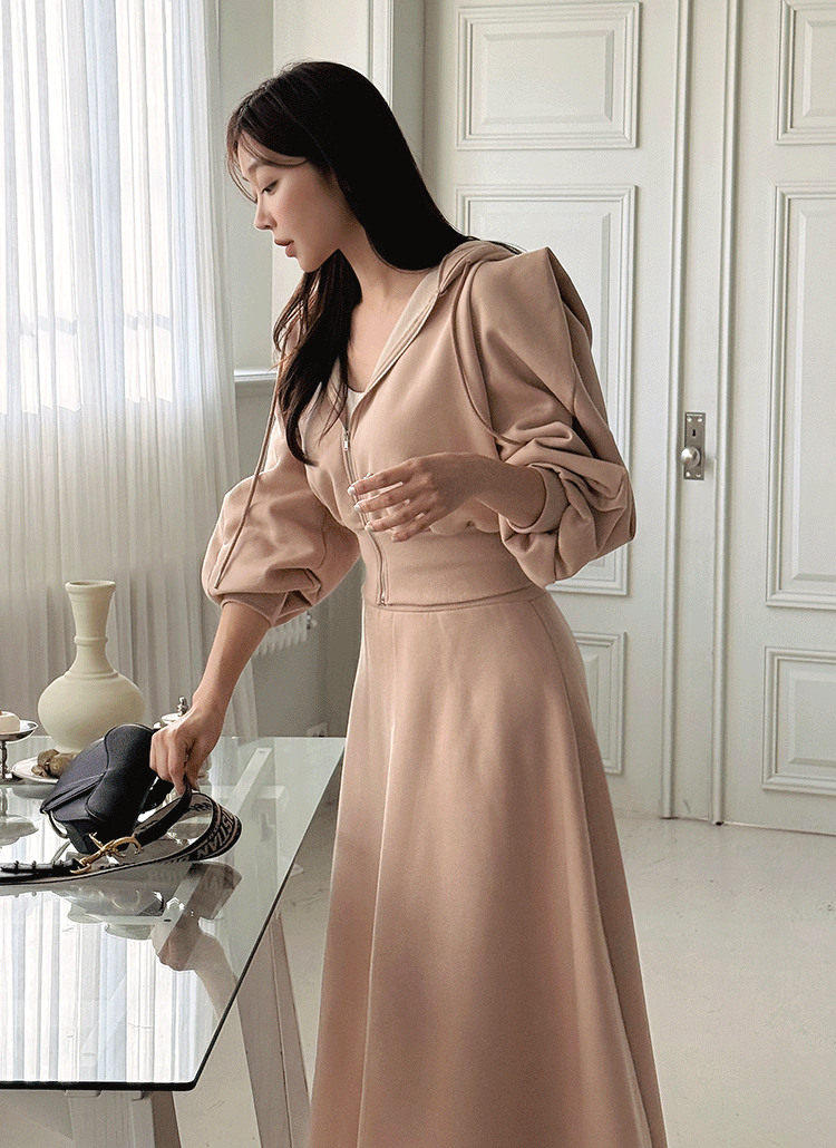 裏起毛ウエストゴムロングフレアパフスリーブ長袖フードジップアップポケットセットアップスカートジップパーカー