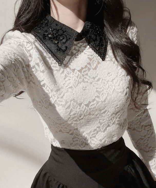 長袖ラウンドネックペンダントスリム配色レースTシャツ