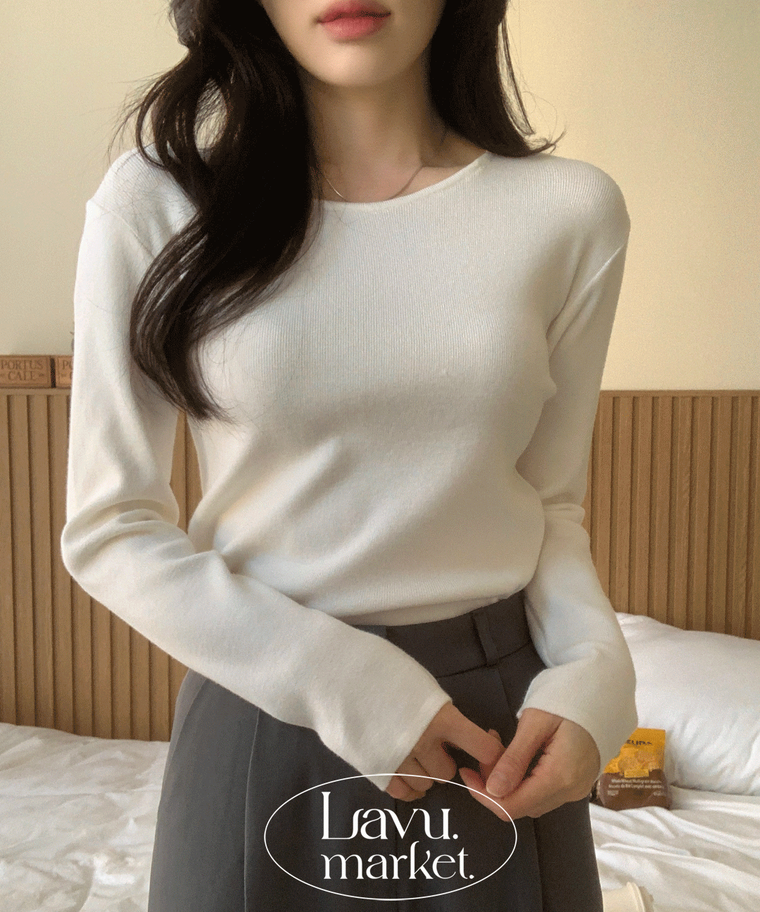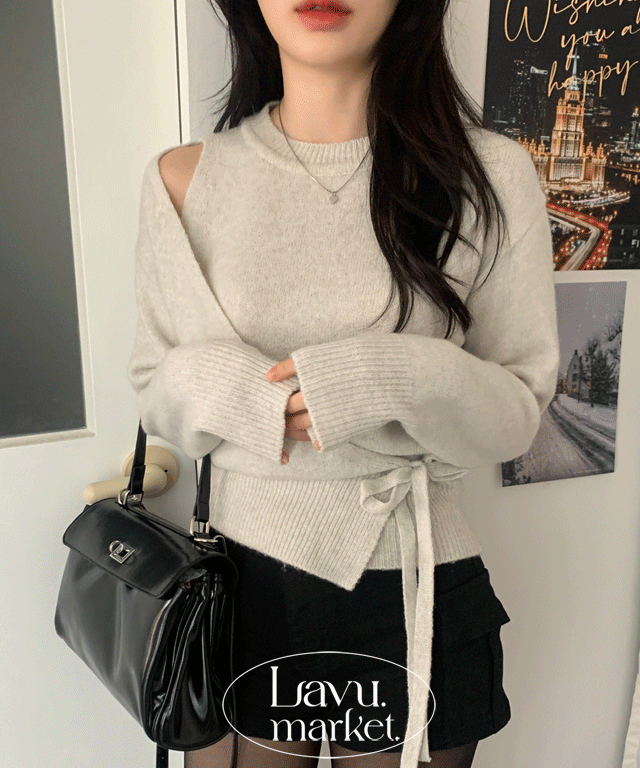 メランジラウンドネックラップアンバランス長袖ニット