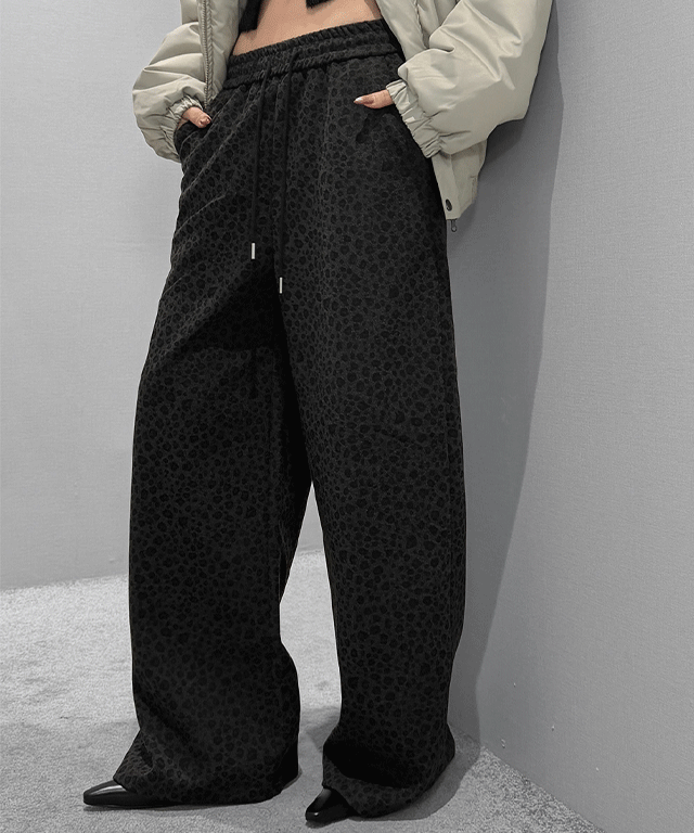裏起毛ワイドウエストゴムロングポケットレオパードパンツ