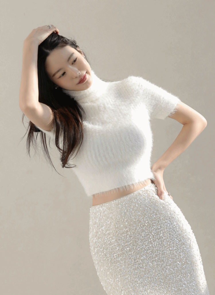 ソフトエコファーシャギースリム半袖セミクロップドタートルネックニット