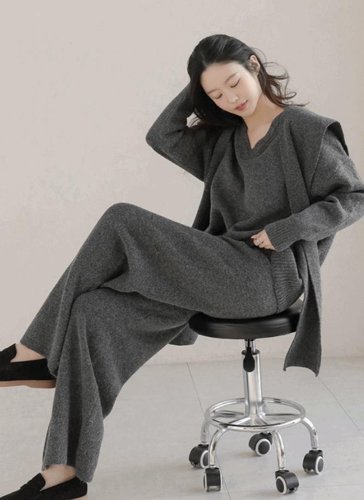 ソフトウエストゴムフレアミニラウンドネック長袖ルーズセットアップスカートニット