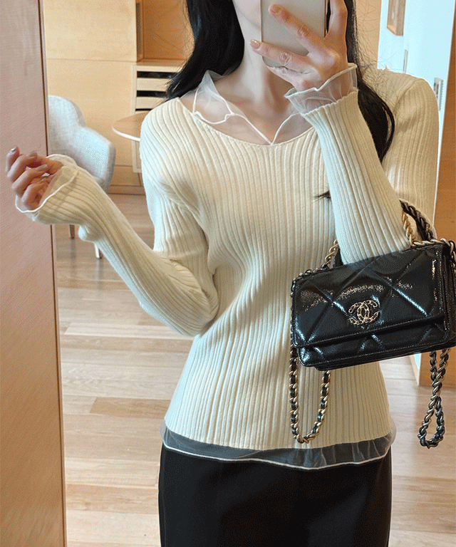 シースルーストレッチコンビ配色カラースリムレイヤード風長袖ニット